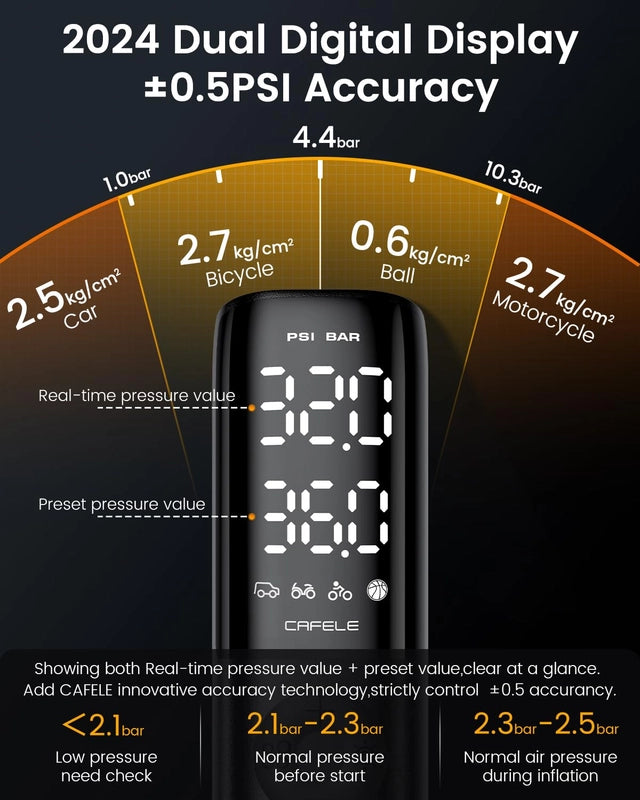 Air Compressor, Car Tyre Pump with Dual Digital Display, Smart Preset and Auto Stop, 350cm Power Cable, Fabric Bag, Light for Car, Motorbike, Bicycle and Ball.