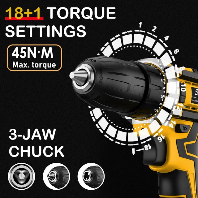 18+1 Torque, 45Nm Max, LED Light, Spirit Level, 10mm Keyless Chuck, 2 Speed Electric Screwdriver for Home, Work etc.
